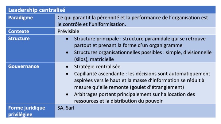 · Le leadership centralisé qui aboutit à une structure centralisée ou divisionnalisée